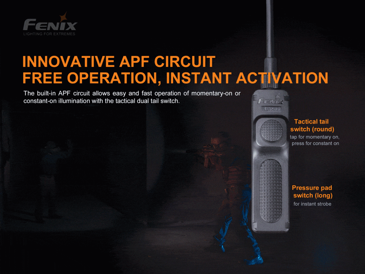 El interruptor remoto Fenix AER-05 está especialmente diseñado para las linternas tácticas con circuitos APF. Su adaptador de cola está fabricado en aluminio A6061-T6 con acabado anodizado duro tipo III y antiabrasivo. El panel doble de interruptores de cola incluye un interruptor con una almohadilla de presión silenciosa y un interruptor táctico redondo; permitiendo una operación fácil y rápida de iluminación momentánea o constante. El innovador diseño sin ruido (mute) con velcro adjunto lo hace muy confiable y práctico en sus misiones tácticas o de caza donde el silencio es imprescindible.