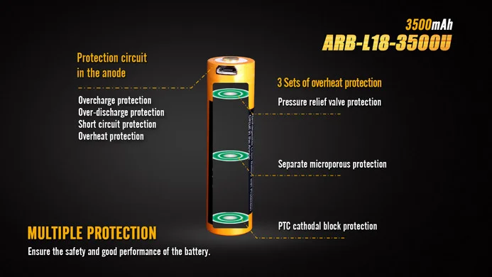 La batería ARB-L18-3500U se puede cargar por su propio puerto micro USB y con un cargador también. Tiene un circuito de protección que está integrado en el ánodo y cubierto con un sombrero de acero remachado. La batería está completamente cubierta con la carcasa de acero, por lo que el riesgo potencial de cortocircuito causado por colisión o impacto esta enormemente eliminado.