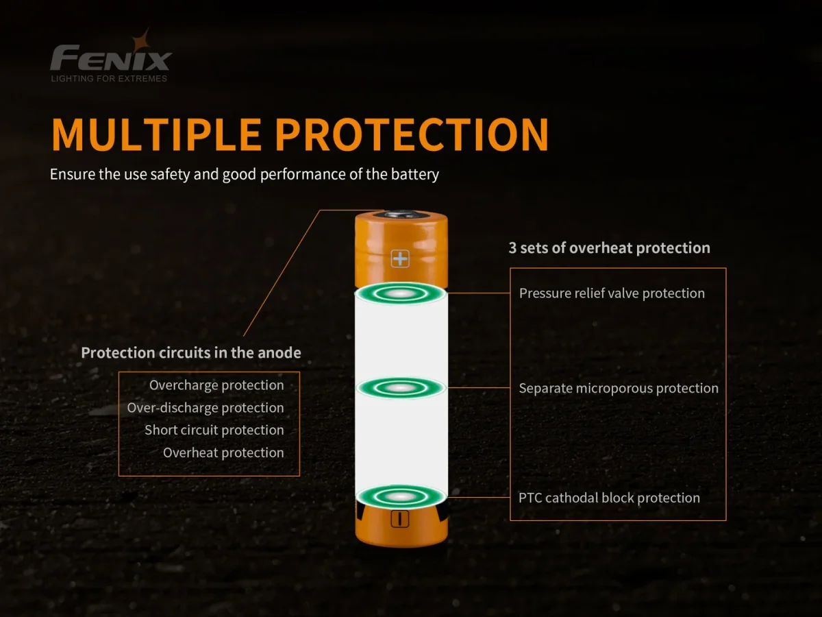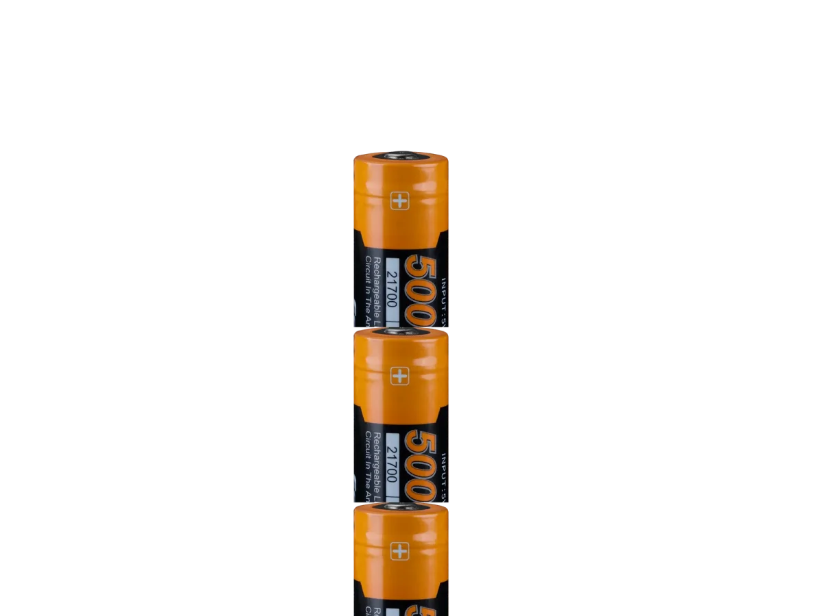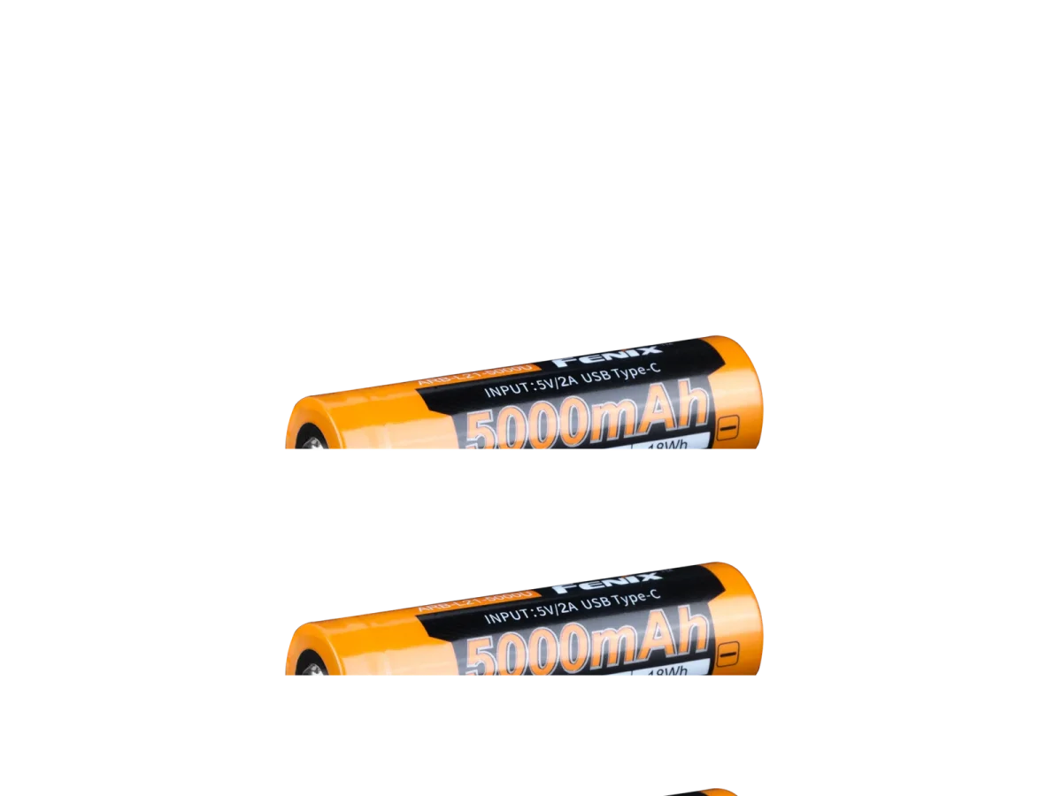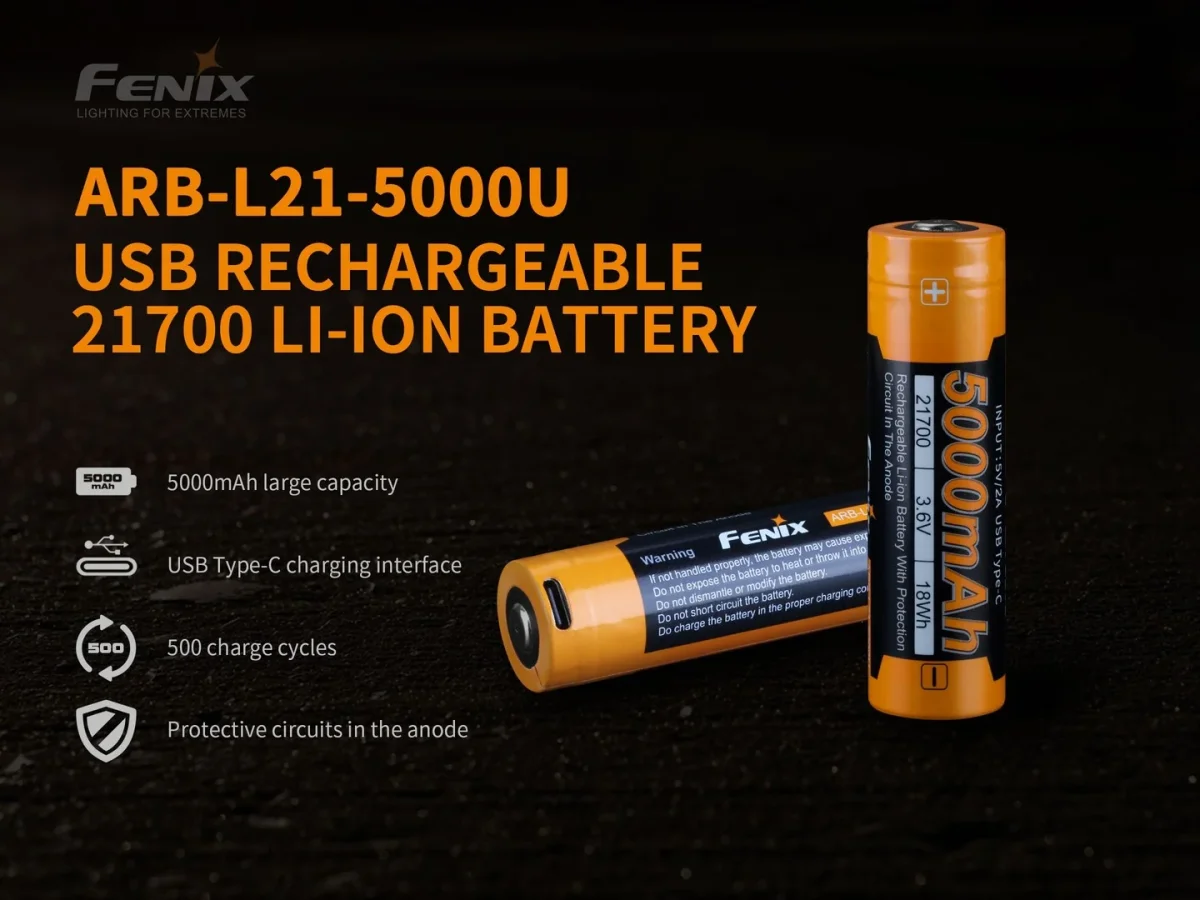 Batería recargable ARB-L21-5000U de iones de litio 21700 USB, gran potencia, rendimiento constante, la capacidad de la batería de 21700 es dos veces más potente que la batería común 18650 / 2300mAh. Lo que proporciona a las herramientas de iluminación suficiente potencia y mayor duración. Protección múltiple, garantiza la seguridad de uso y el buen rendimiento de la batería; Tecnología de remachado de carcasa de acero, protege completamente la batería contra daños; Los respiraderos de alivio de presión expulsan rápidamente el gas interno.