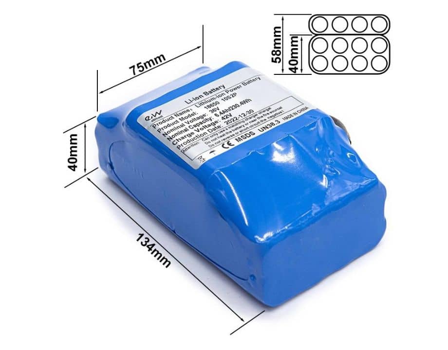 Batería diseñada para Ewheel con celdas EVE nueva 18650 de buena calidad, todas las baterías son comprobadas antes de ser enviadas. Fabricada a medida para instalarla en el mástil de Xiaomi, Cecotec o marcas de similares características en una bolsa de 1, 2 o 3l. Puede conectarse en paralelo. No se recomienda conmutada dado a su reducida potencia.