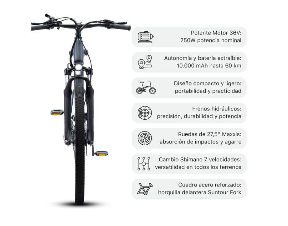 Su motor eléctrico de 36V con 250W de potencia, junto con una batería extraíble de 36V y 10Ah, te permitirá recorrer hasta 60 km sin problemas.
