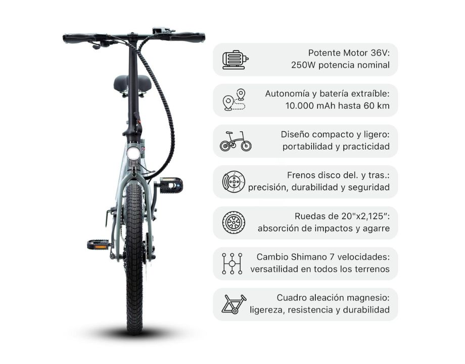 Su motor eléctrico de 36V con 250W de potencia, junto con una batería extráible de 36V y 10Ah, te permitirá recorrer hasta 60 km sin problemas.