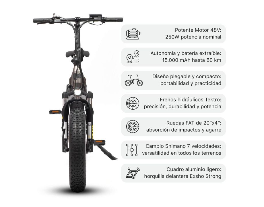 Una de sus características más destacadas es su sistema de plegado, que facilita su almacenamiento y transporte. Puedes doblarla rápidamente y guardarla en espacios reducidos, lo que la convierte en una opción ideal para quienes buscan comodidad y practicidad. Además, la bicicleta está equipada con una batería extraíble de 15 Ah que proporciona una autonomía de más de 60 km, permitiendo largas jornadas de paseo sin preocuparse por quedarse sin carga.