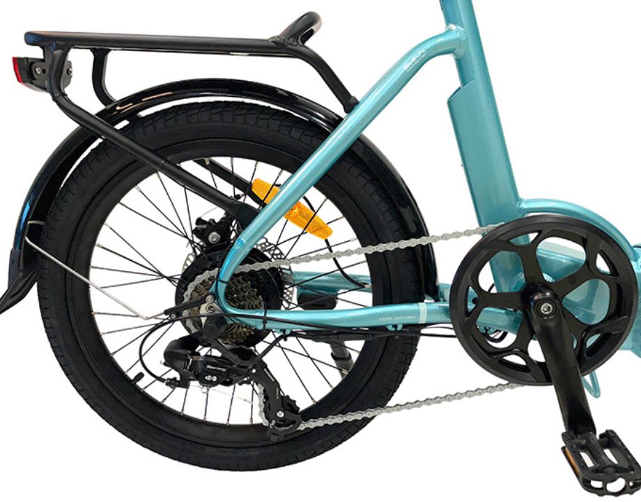 Además, cuenta con cambios Shimano Tourney de 7 velocidades, frenos de disco Tektro, manetas de freno Z-Star engomadas, neumáticos Kenda de 20″x1.95 y luces frontal y trasera alimentadas por la batería.