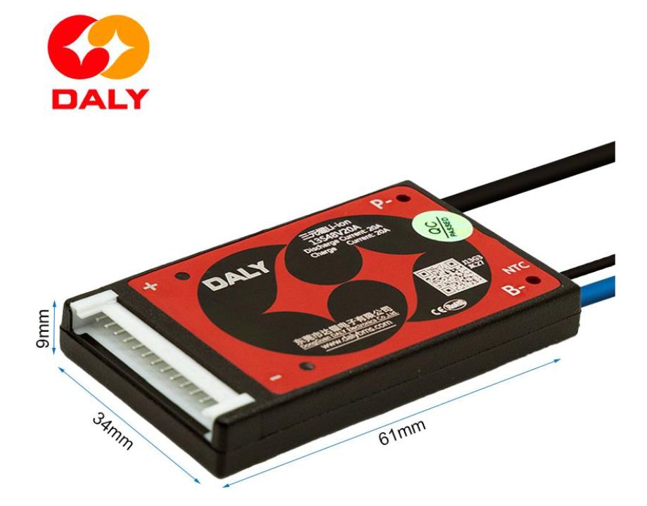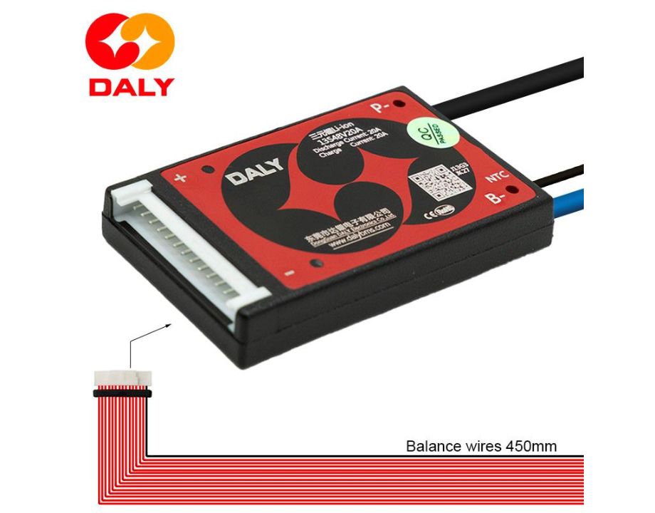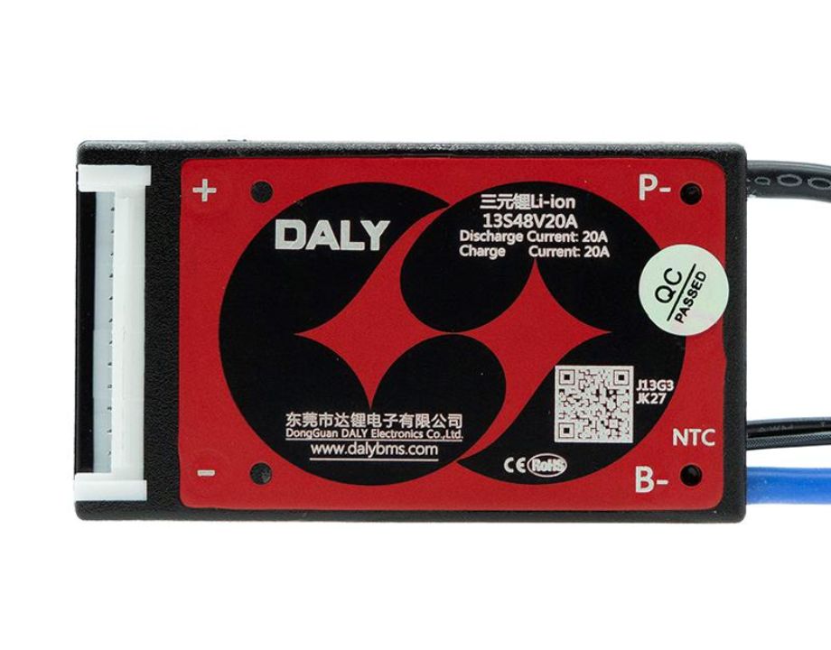 BMS de la marca Daly para baterías de 48v(13s) con una capacidad de descarga de 20A.