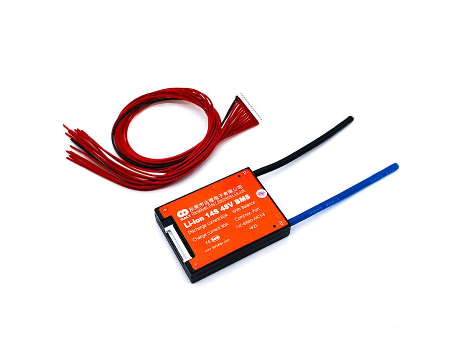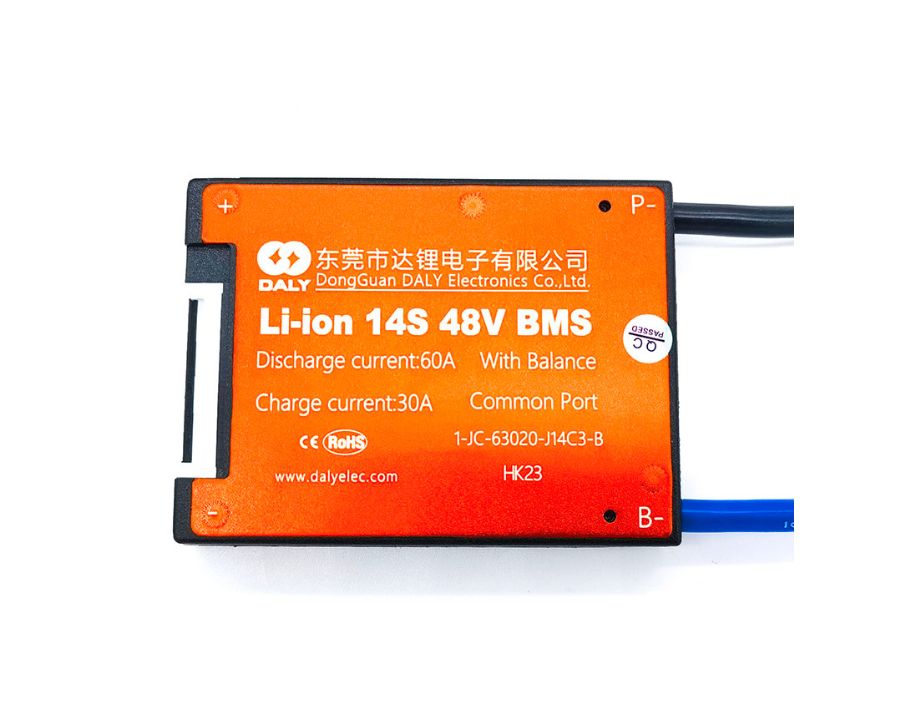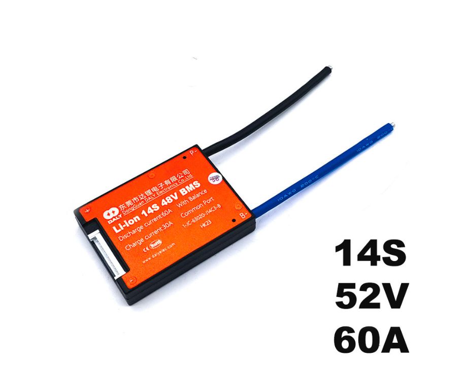 BMS de la marca Daly para baterías de 52v(14s) con una capacidad de descarga de 60A.