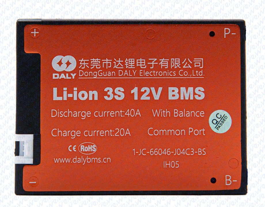 BMS de la marca Daly para baterías de 12v(3s) con una capacidad de descarga de 40A.