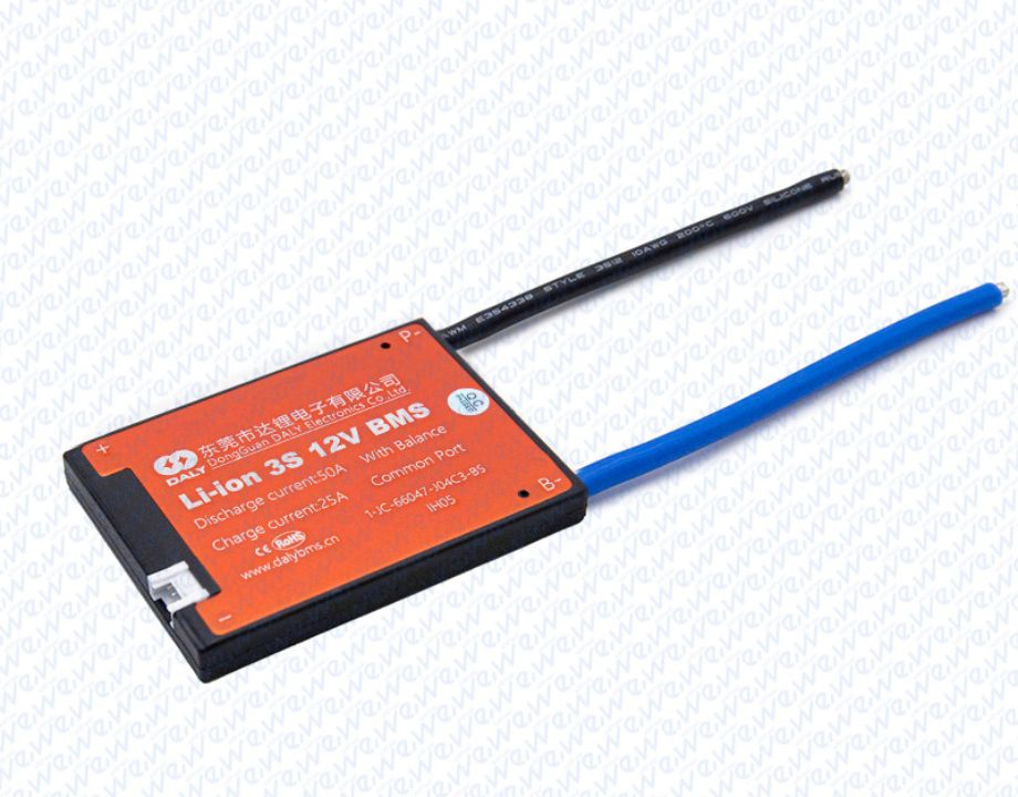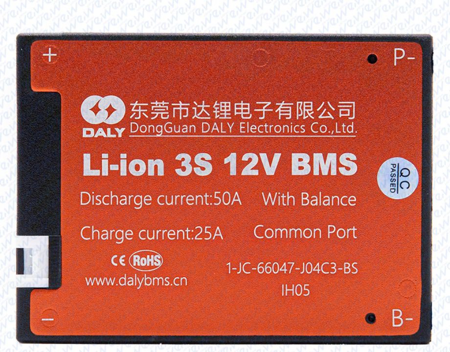 BMS de la marca Daly para baterías de 12v(3s) con una capacidad de descarga de 50A.