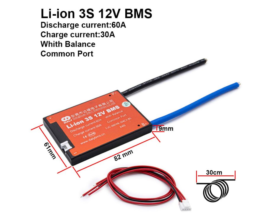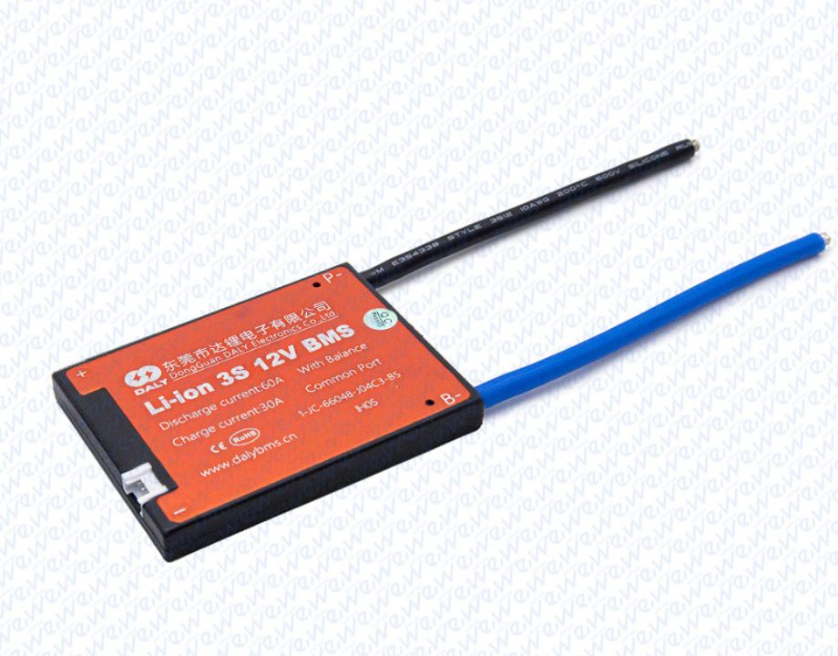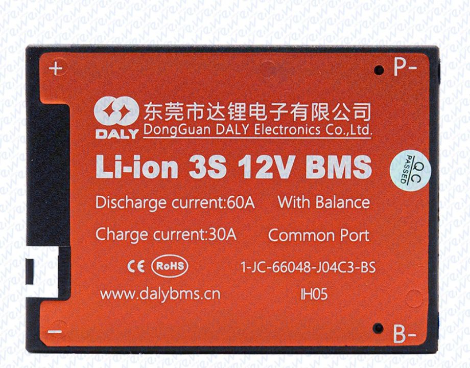 BMS de la marca Daly para baterías de 12v(3s) con una capacidad de descarga de 60A.