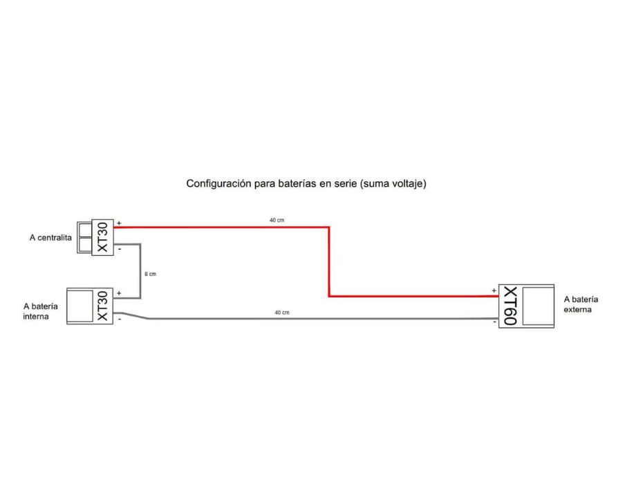 Este cable sirve para sumar voltajes a la controladora de cualquier patinete eléctrico, ello se consigue con una configuración de baterías en serie, que consiste en sumar a la batería original, el voltaje de la segunda batería que queramos instalar a través de nuestro cable.