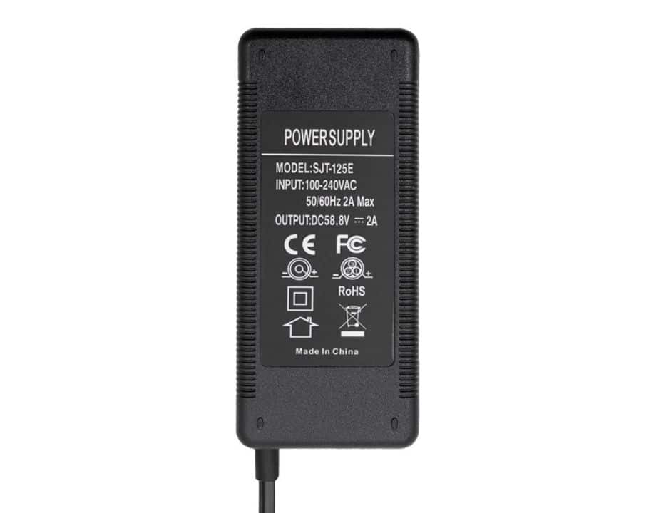 Cargador de 52v con un voltaje máximo de 58,8v con una corriente de carga de 2A y conector GX16.