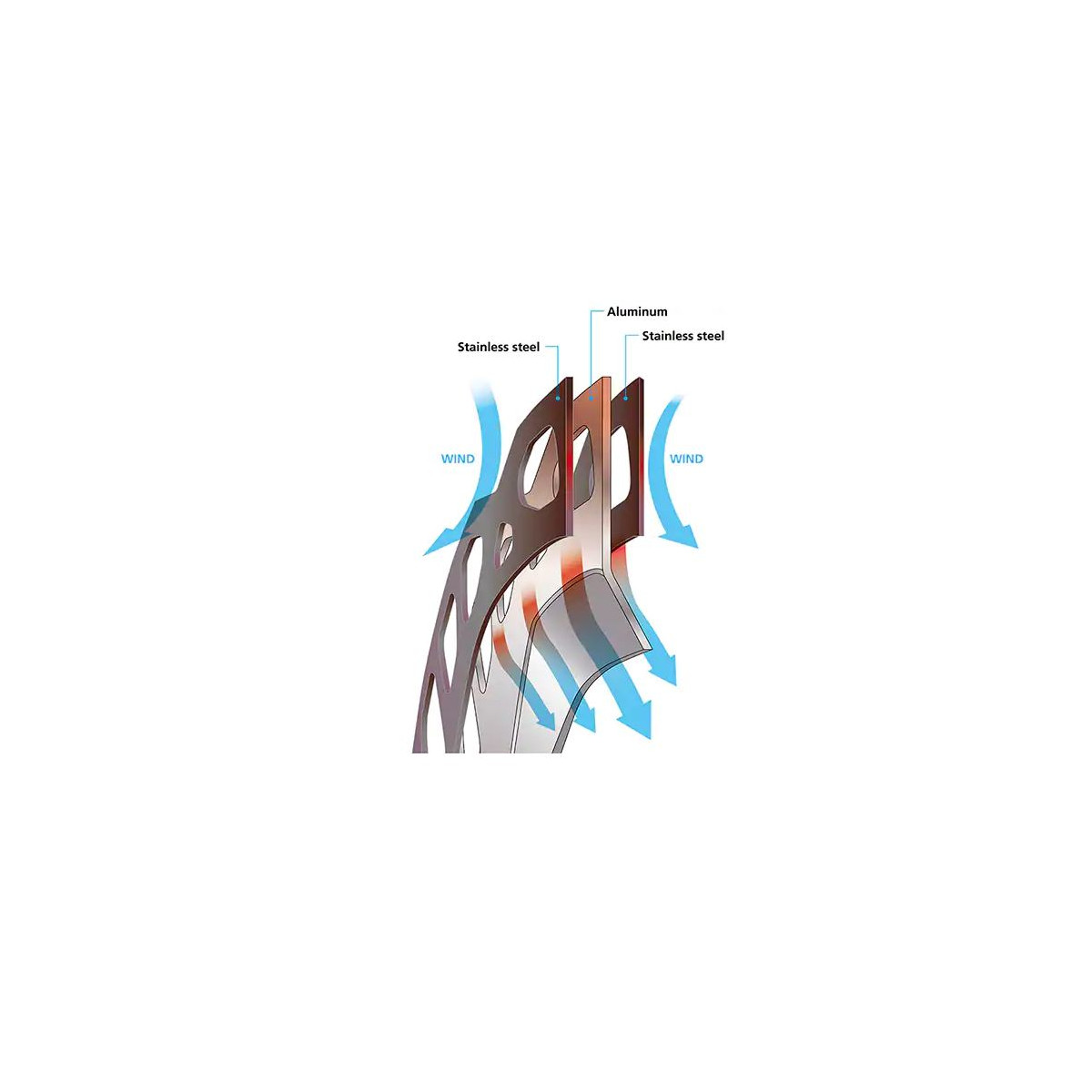 El Disco Shimano XT MT800 ICE TEC Center Lock con tecnología ICE TECH esta diseñado para disipar el calentamiento y retardar al máximo el exceso de temperatura. Con esto conseguimos un mejor rendimiento de frenada y una duración mas larga de la vida de las pastillas. El núcleo del disco es de aluminio y se forma un sándwich fundido con la capa exterior de un acero duradero. Además las aletas disipan el calor y ayudan también a que el calor no se acumule.