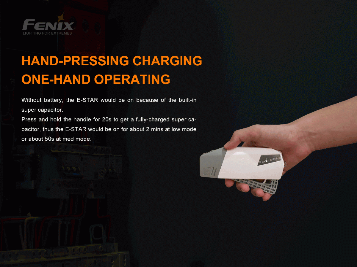 La Fenix E-star es una linterna portátil accionada mecánicamente (tipo de presión manual) para emergencias, incluidas áreas que carecen de un suministro de energía estable y áreas afectadas por desastres; como equipo PSK / BOB, también se puede usar como linterna de respaldo para actividades al aire libre prolongadas. Fenix E-STAR tiene cuatro niveles de brillo diferentes. Los modos medio y bajo pueden funcionar sin interrupción presionando manualmente el mango. Los modos alto y turbo tienen como objetivo brindar una mejor experiencia de iluminación cuando se usa con una batería. La linterna permite su uso mientras se carga, presionando con una sola mano para generar energía, lo cual es fácil incluso para una operación prolongada. Otra fuente de alimentación proviene de la batería Ni-MH de baja autodescarga incluida, también se puede usar una batería AA común. Y la linterna admite la carga USB tipo C, con el supercondensador incorporado, ayuda con el almacenamiento de energía y el almacenamiento en búfer cuando la batería está dañada o falta.