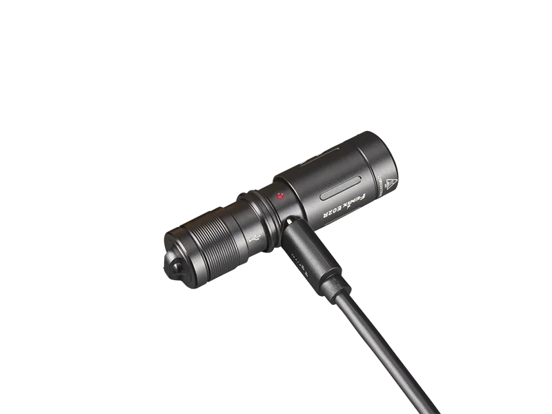 Incluye: Linterna E02R negra, Cable de carga, instrucciones, batería, O-ring, anillo metálico para llaves.