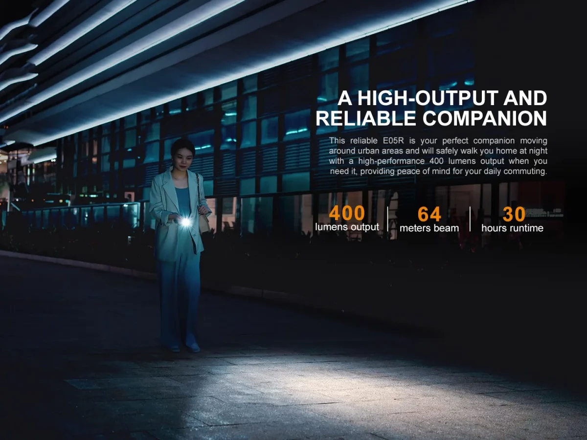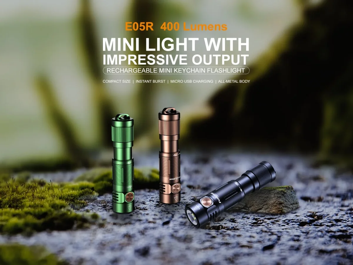 La linterna Fénix ​​E05R es una mini linterna recargable que puede emitir hasta 400 lúmenes, incorpora una batería de polímero de litio de 320 mAh.