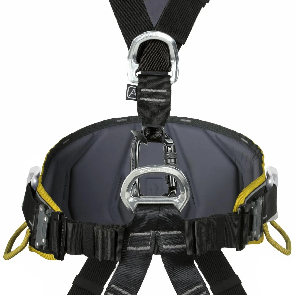 - mosquetón OXY de triple cierre utilizado para la conexión de las correas de los hombros al punto principal para aumentar el espacio para la fijación del ascensor de pecho