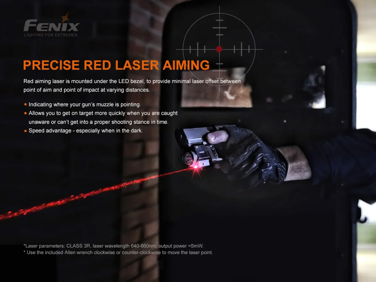 La luz táctica láser roja Fenix GL22 es una combinación compacta de luz blanca y de un láser rojo, que integra una amplia compatibilidad y una gran precisión.
