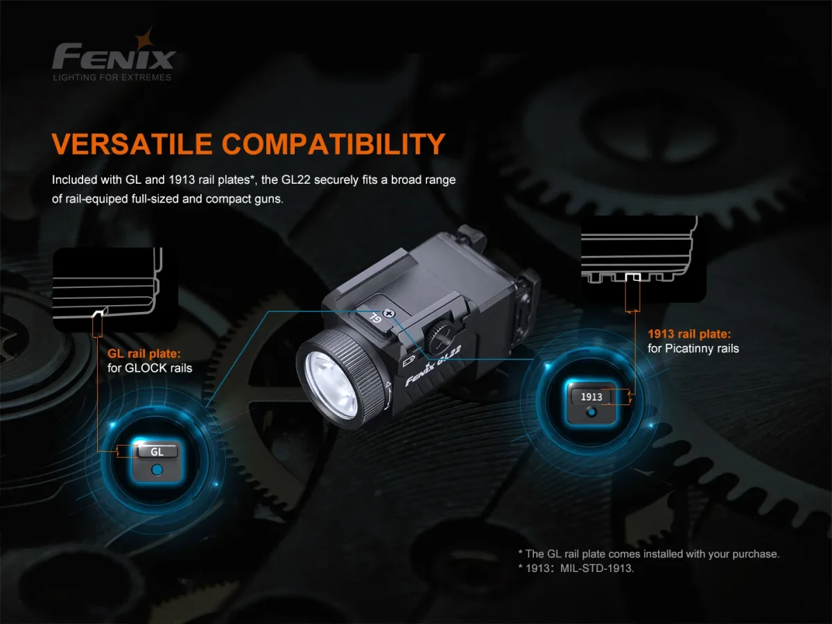 - La Linterna GL22 es compatible con Glock y riel Picatinny MIL-STD-1913, incluido el Glock 36 con riel estándar y Springfield XD.