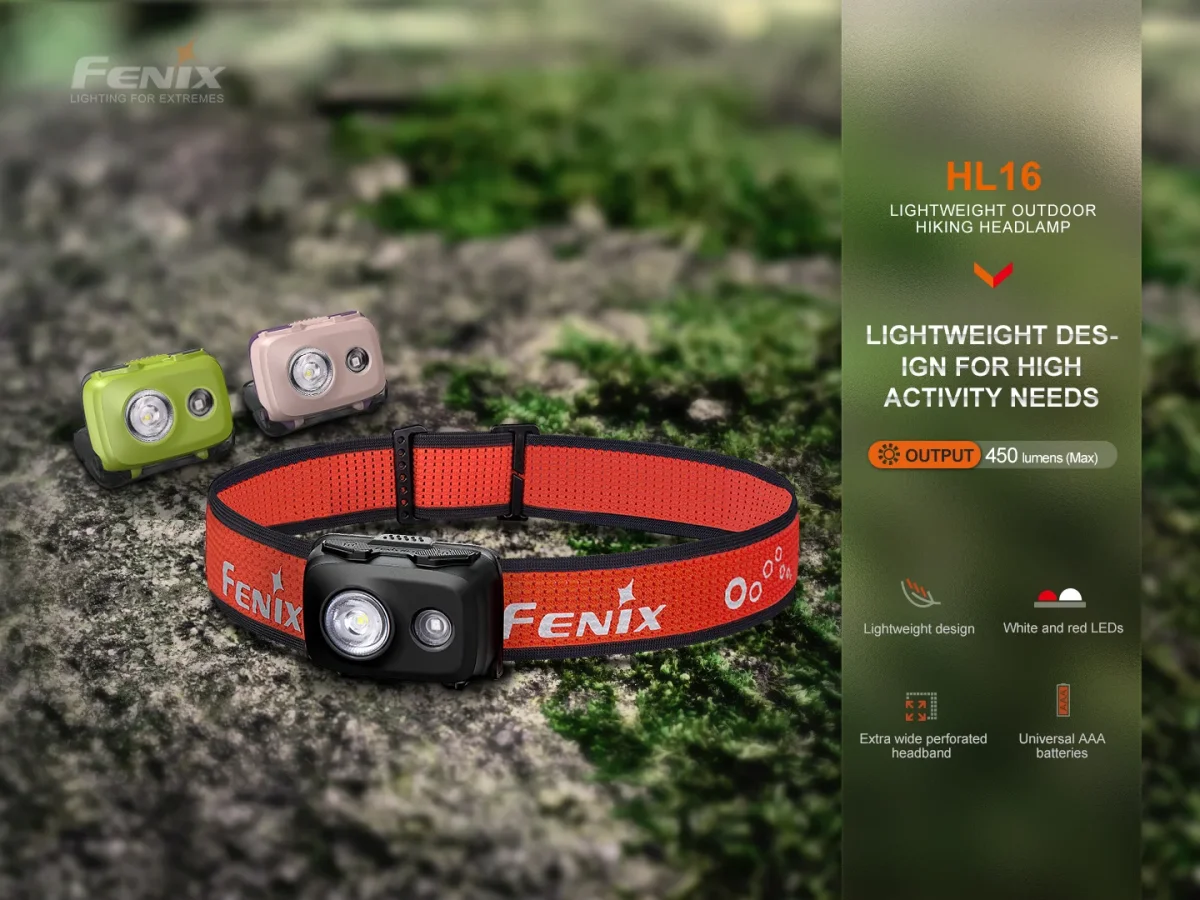 La nueva Fenix ​​HL16 compacta es una linterna frontal alimentada por batería AAA que puede alcanzar una salida máxima de 450 lúmenes e iluminar una distancia de hasta 104 metros. El conveniente interruptor dual controla rápidamente cuatro niveles de brillo del modo de luz blanca y luz roja, SOS del modo de luz roja. La Fenix HL16 está hecha de material de PC de alta resistencia, lo que la hace duradera, resistente y liviana.