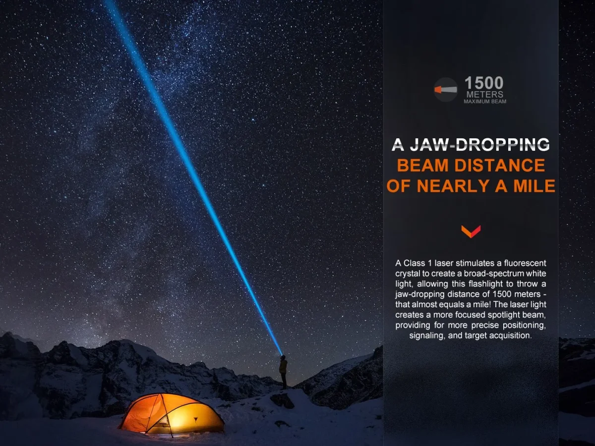 Un láser Clase 1 estimula un cristal fluorescente para crear una luz blanca de amplio espectro, lo que permite que esta linterna tenga un alcance de una distancia asombrosa de 1500 metros, ¡eso es un kilómetro y medio!