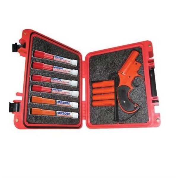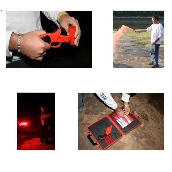 LANZADOR DE SEGURIDAD DE CALIBRE 12 RESISTENTE A LA CORROSIÓN CON UNA BANDOLERA QUE PUEDE CONTENER HASTA 6 SEÑALES