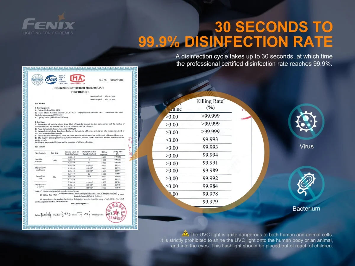 Según el informe de prueba del laboratorio microbiológico, el 99,9% de las bacterias comunes se pueden desinfectar en 30 segundos; la tasa de desinfección puede alcanzar el 99,999% en 1 minuto. Por lo tanto, esta linterna UVC portátil posee una intensidad que puede satisfacer completamente el uso diario.