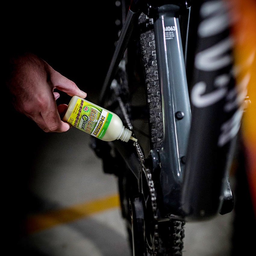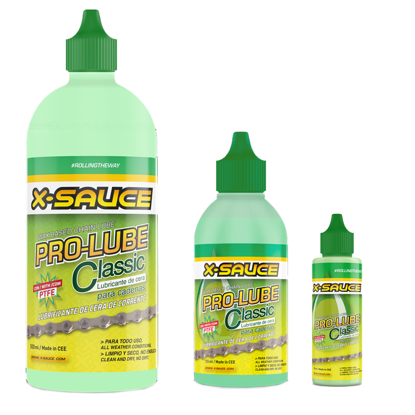 - Lubricante de cera X-Sauce Pro Lube es denso. Aplícalo gota a gota en cada bulón, haciendo girar lentamente las bielas. Comienza por la parte superior de la cadena y luego aplica en la parte inferior. Las caras laterales no necesitan lubricación, ya que solo atraerían suciedad.