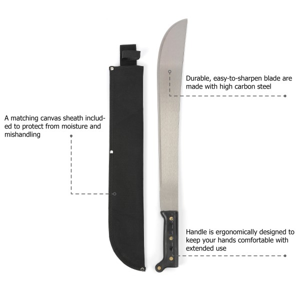 ESTE MACHETE CON FUNDA OZARK TRAIL DE 18 PULGADAS LE AYUDA A LIMPIAR RÁPIDAMENTE LAS RAMAS Y EL CEPILLO. YA SEA QUE ESTÉ ABRIENDO CAMINO EN UN BOSQUE DENSO O SIMPLEMENTE LIMPIANDO ALGUNOS JARDINES ALREDEDOR DEL JARDÍN, ESTE MACHETE HARÁ EL TRABAJO MÁS RÁPIDO QUE CUALQUIER CUCHILLO GRANDE O SIERRA. LA HOJA DURADERA Y FÁCIL DE AFILAR ESTÁ HECHA CON ACERO CON ALTO CONTENIDO DE CARBONO PARA GARANTIZAR QUE SU MACHETE PUEDA CORTAR EL CEPILLO MÁS RESISTENTE Y RESPONDER BIEN A CUALQUIER AFILADOR DE MACHETE BÁSICO. EL MANGO ESTÁ DISEÑADO ERGONÓMICAMENTE PARA MANTENER SUS MANOS CÓMODAS CON UN USO PROLONGADO.