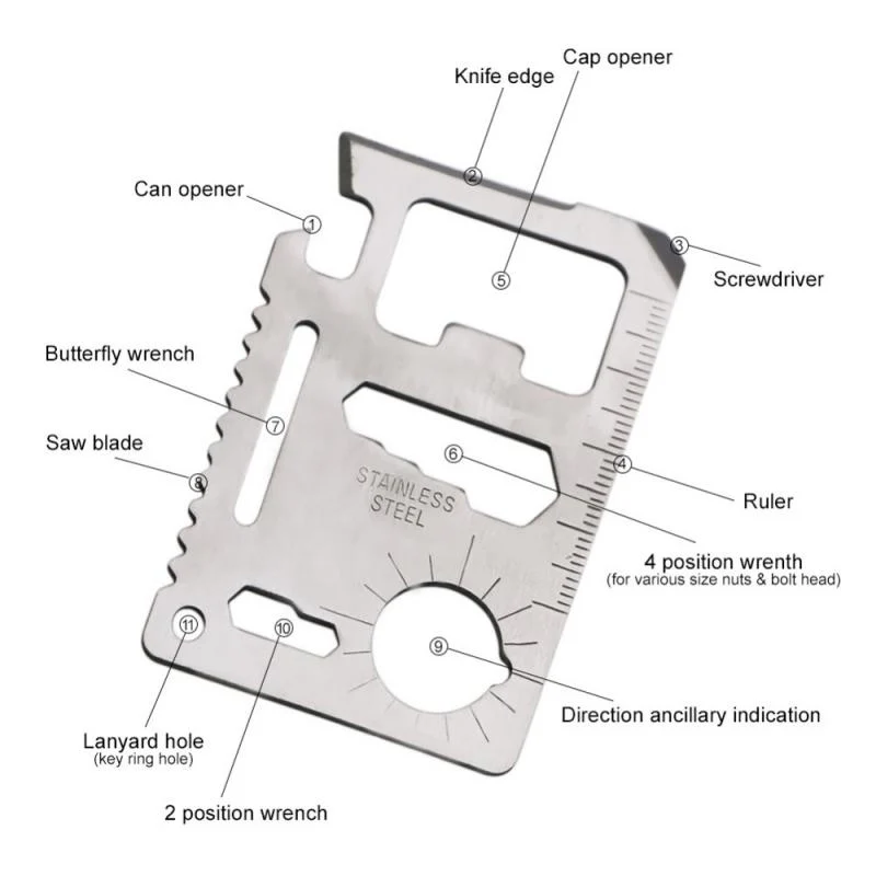 Functions: Can Opener, Knife Edge, Screwdriver, Ruler, Bottle Opener, Butterfly Screw Wrench, 2-Position Wrench, Saw Blade, Direction Auxiliary Indication, 4-Position Wrench, Keychain Hole