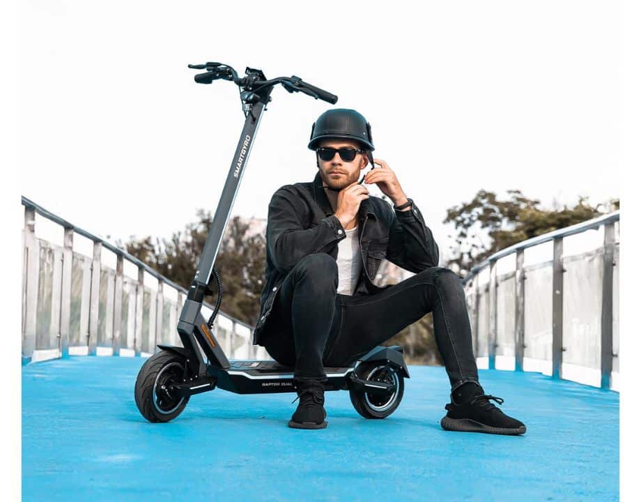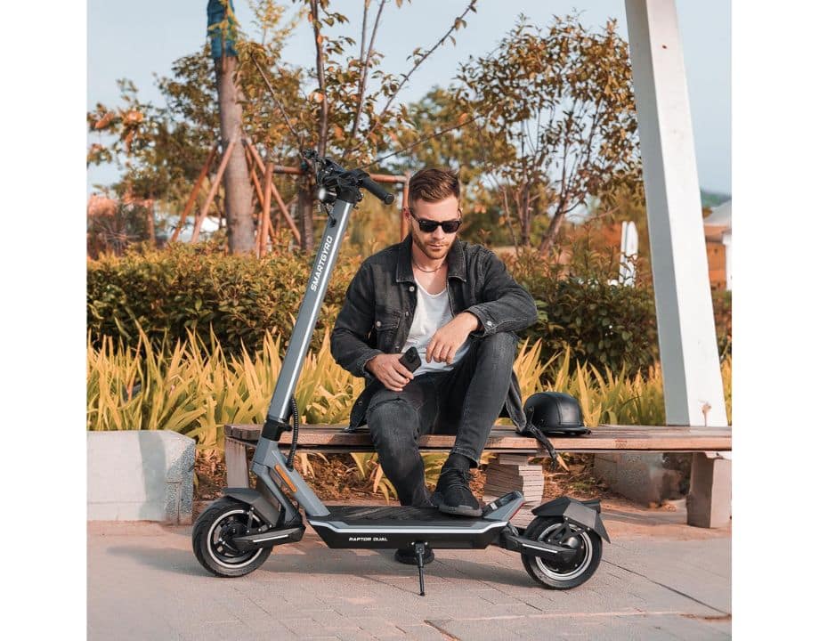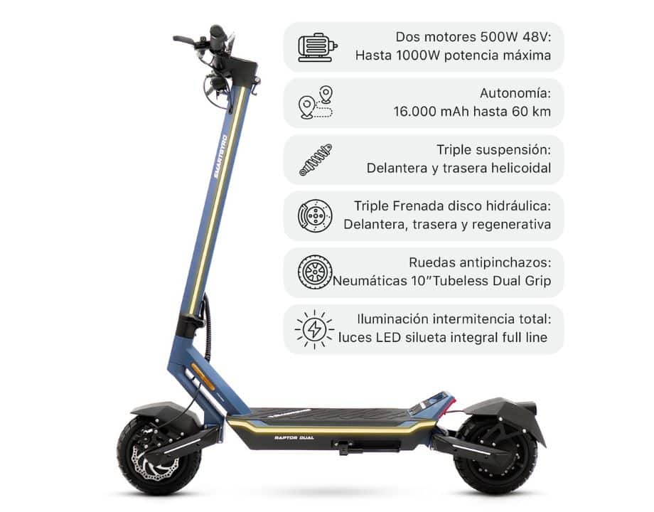 El SmartGyro Raptor Dual EVO es un patinete eléctrico homologado diseñado para quienes buscan un rendimiento superior y versatilidad en cualquier terreno. Con doble motor, autonomía de hasta 60 km y doble suspensión, combina potencia, seguridad y confort en cada desplazamiento urbano o todoterreno.