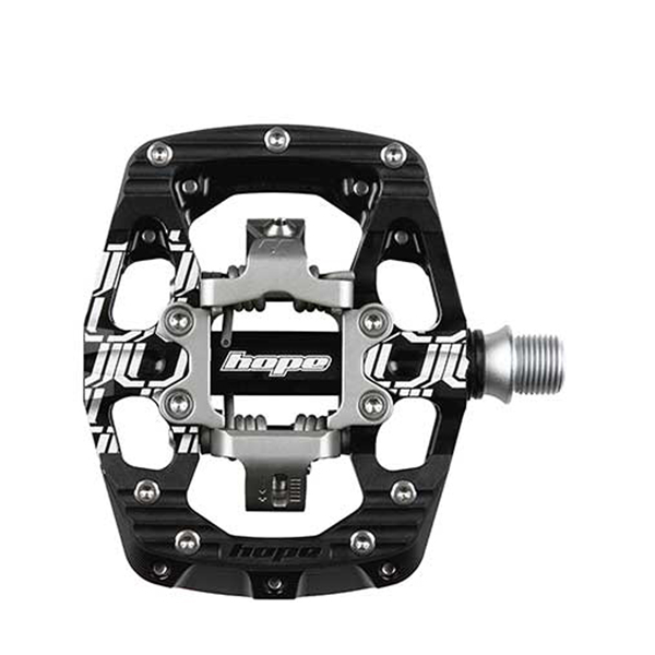Los nuevos pedales Hope Union Gravity Clip GC han sido diseñados para las modalidades de Enduro y Downhill. Su amplia plataforma ha sido fresada en torno CNC y tiene 7 pines reemplazables por cada cara para mejorar el grip en las condiciones más complicadas. El cuerpo del pedal gira sobre un eje de acero Cr-Mo de alta resistencia, y gracias a su amplia superficie de contacto hace que el pedal se note estable y seguro. Con unos rodamientos sellados de alta calidad, el agua y suciedad se mantendrán al margen para que el rendimiento y buen funcionamiento del pedal se mantenga durante mucho más tiempo.