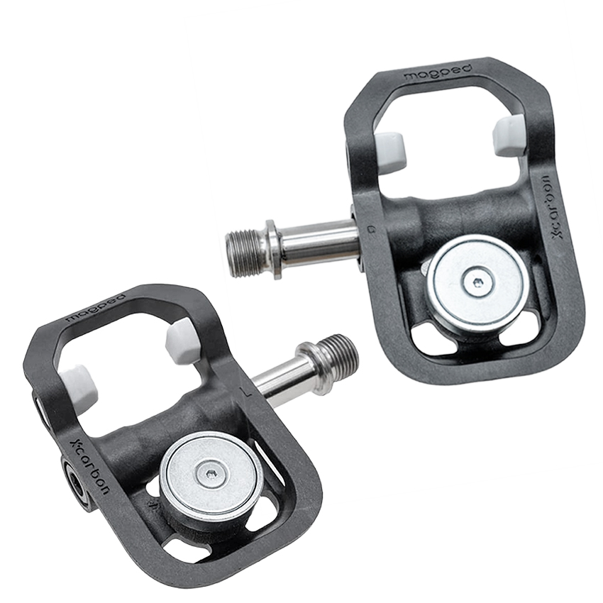 Los Pedales Magnéticos Magped Road2 xCarbon con eje de titanio tiene un peso muy contenido y un ingenioso sistema que nos permite sacar nuestro pie del pedal con mas facilidad en situaciones complicadas.
