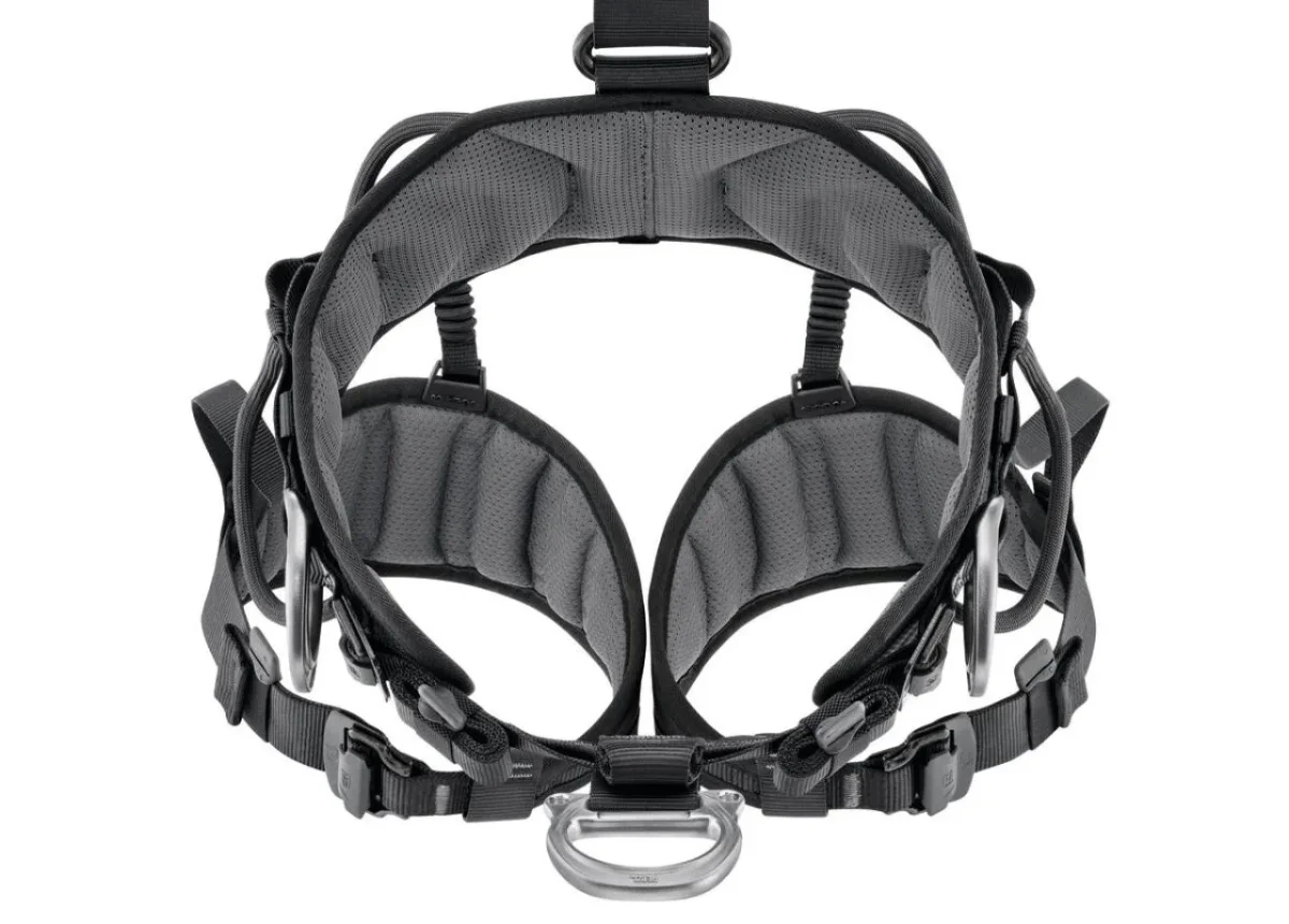 – Todas las zonas de contacto, tirantes, cinturón y perneras, con espuma preformada y acolchada de tejido transpirable, permiten al usuario evolucionar y trabajar confortablemente.
