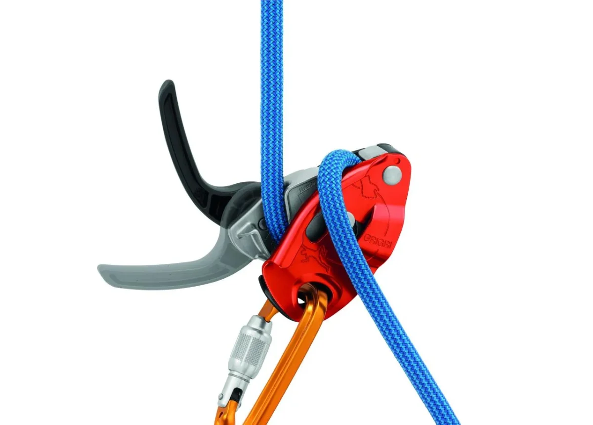 – Bloqueo asistido mediante leva que ofrece una gran tolerancia de la posición de la mano lado frenado, independientemente del ángulo entre la cuerda del escalador y la del lado frenado.
