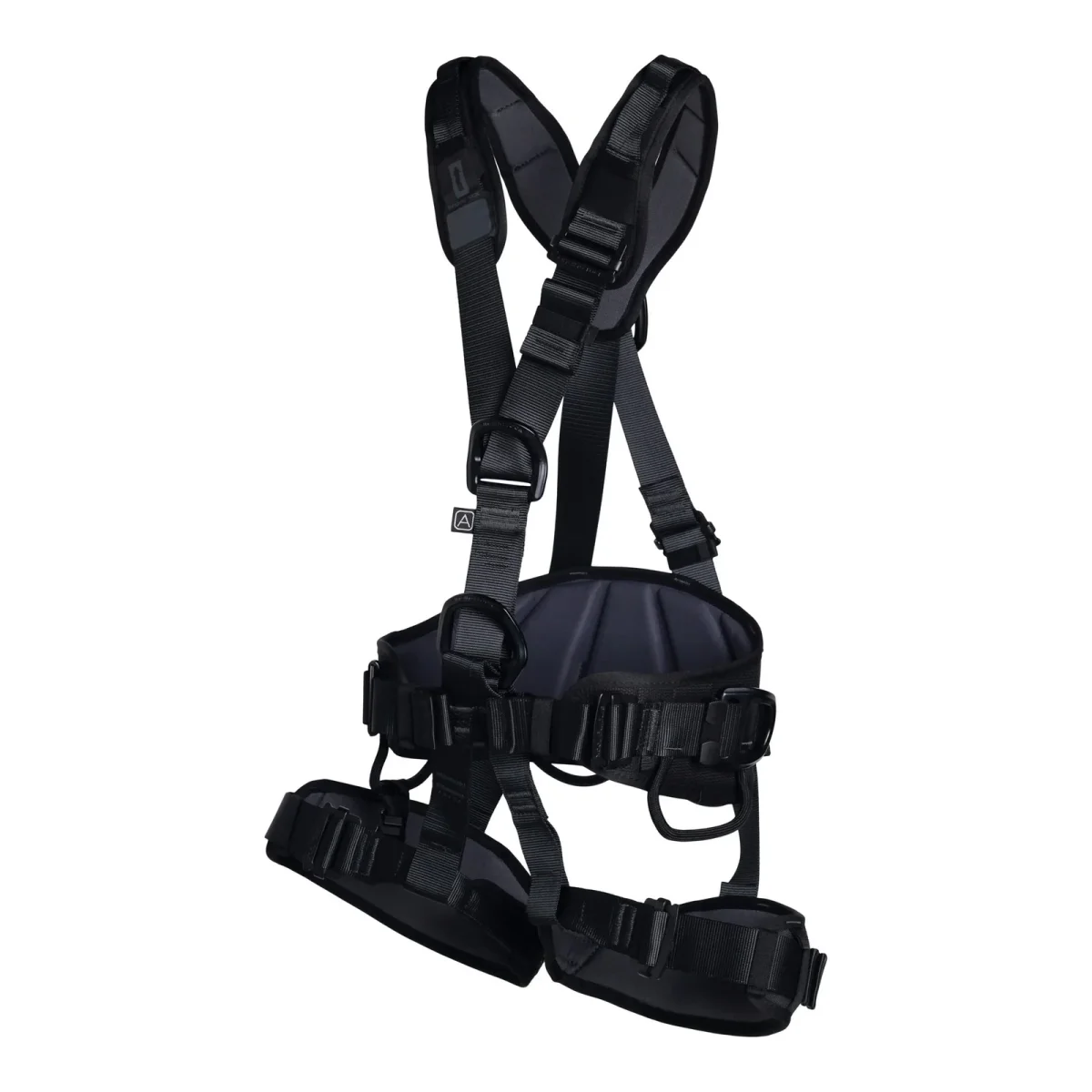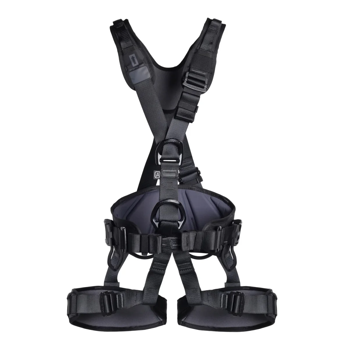 Arnés totalmente ajustable para posicionamiento de trabajo con cinchas continuas ajustables, hebillas SPEED, cinturón ancho acolchado, perneras anatómicas y tirantes.