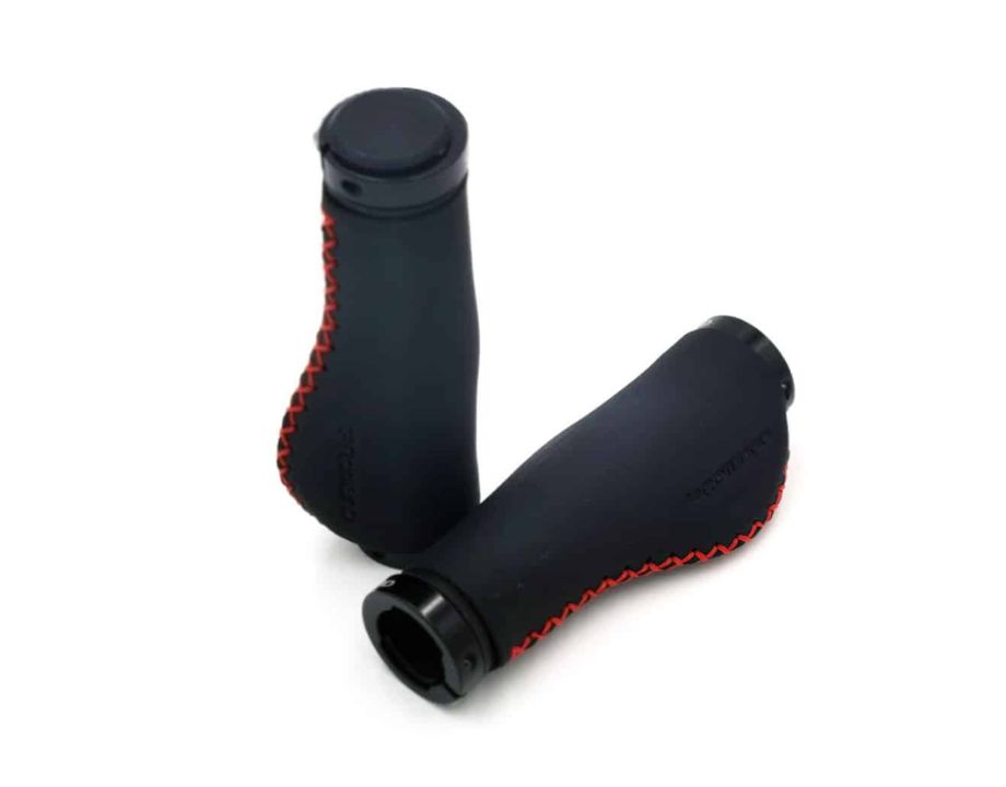 Puños de color negro y costuras rojas para patinete eléctrico.
