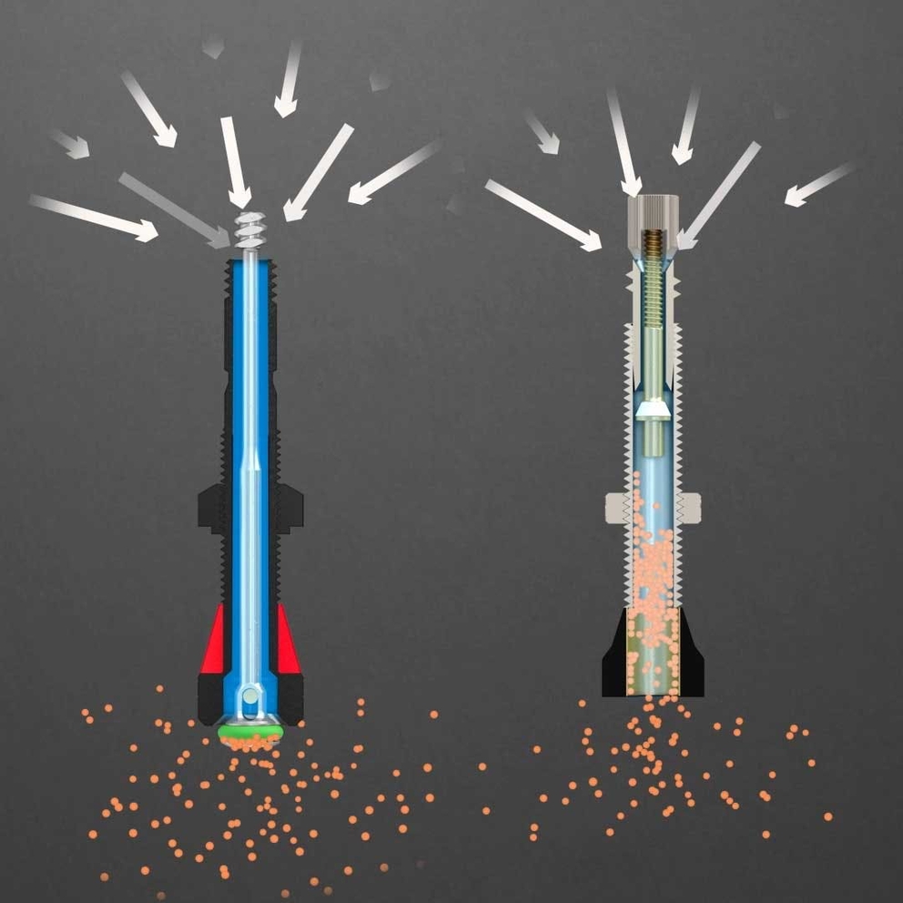- No se obstruye: El diseño patentado elimina la obstrucción al proteger el orificio de aire del contacto con el líquido sellante.