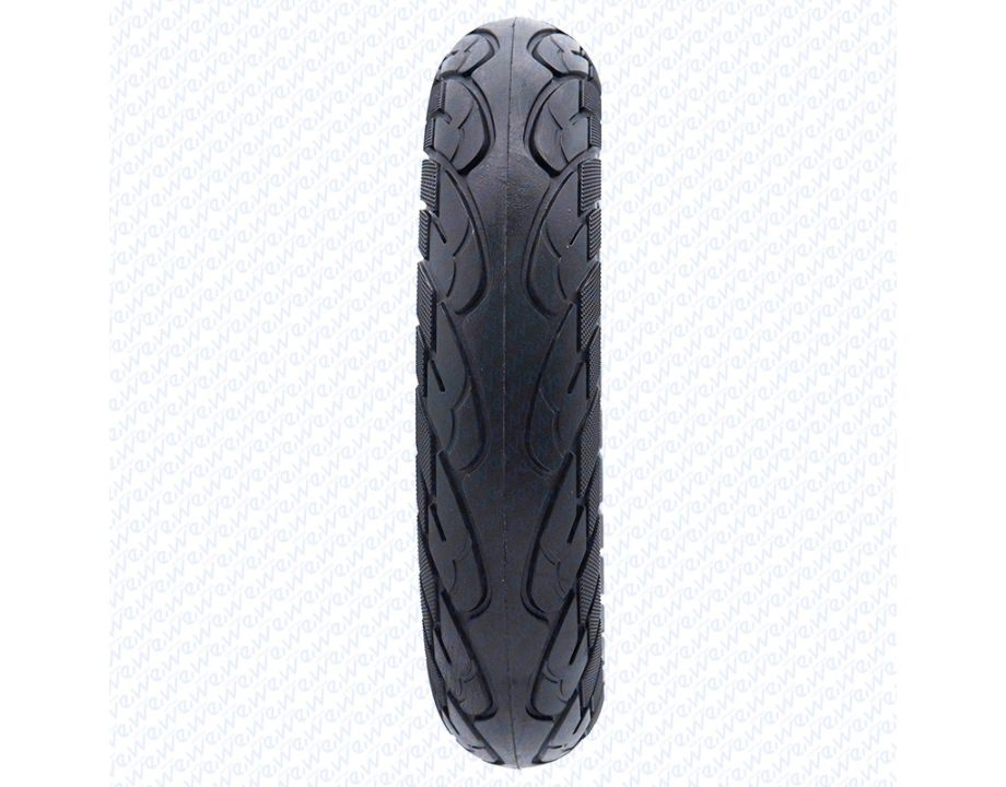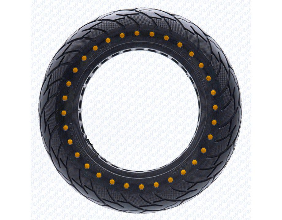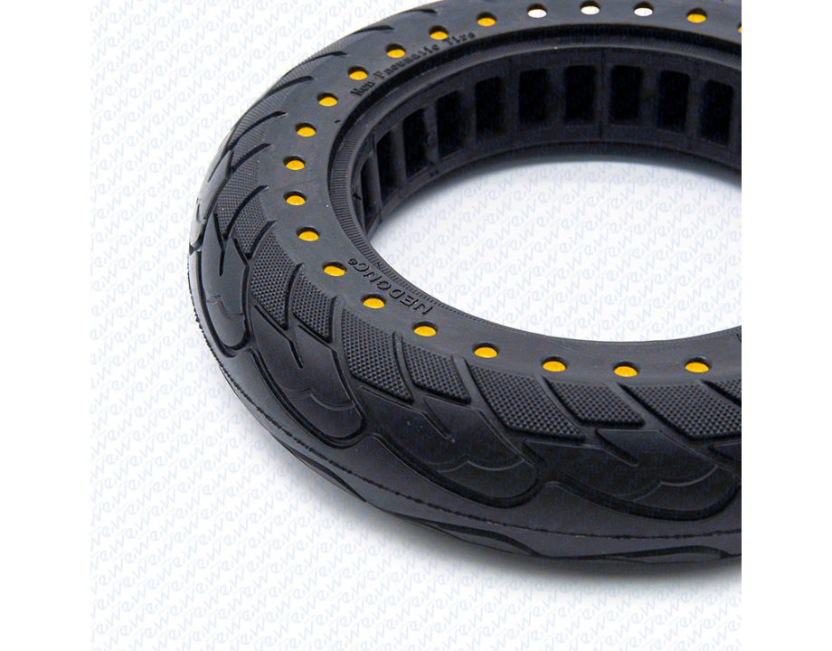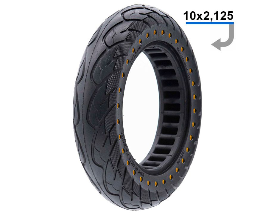 Rueda maciza ultraligera con dimensiones 10×2.125 y puntos amarillos.