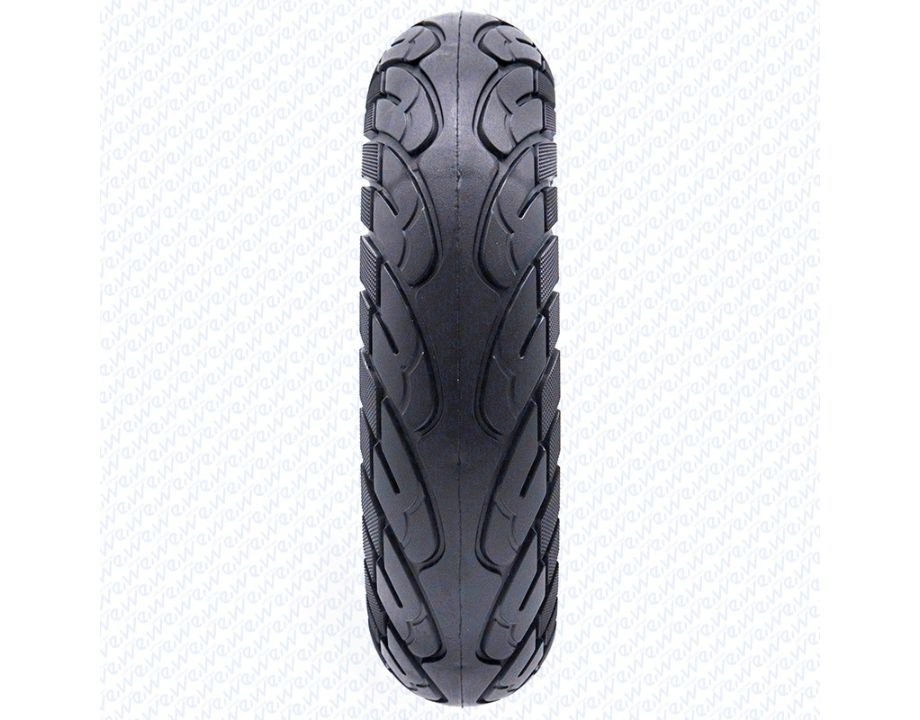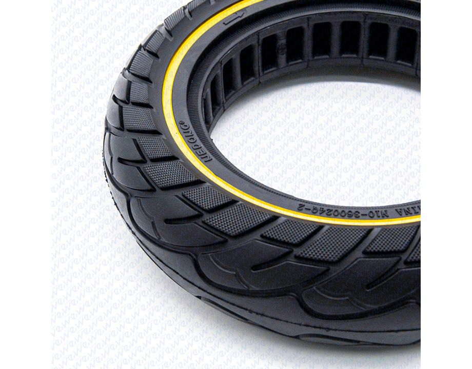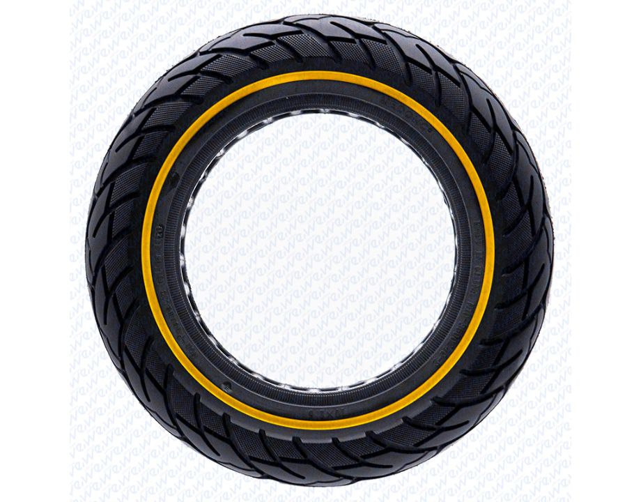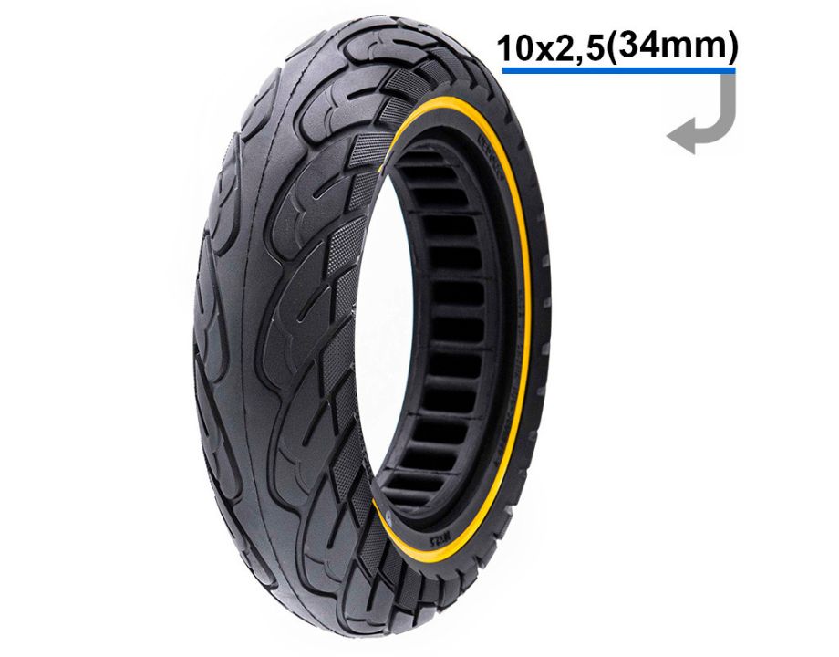 Rueda maciza ultraligera con dimensiones 10×2.5 y linea amarilla.