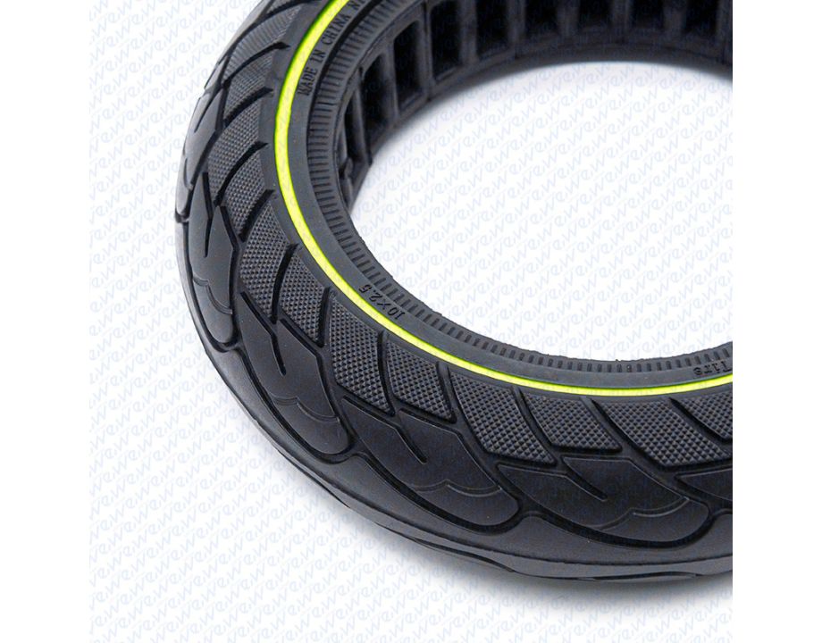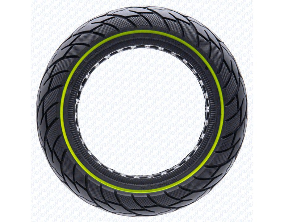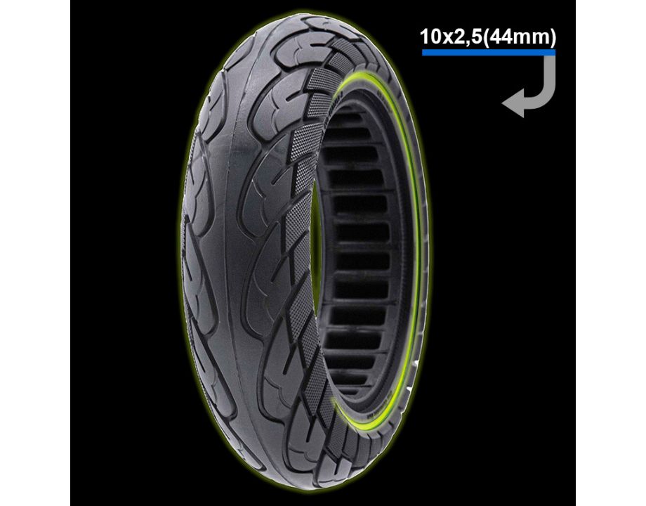 Rueda maciza ultraligera con dimensiones 10×2.5 y línea fluorescente.