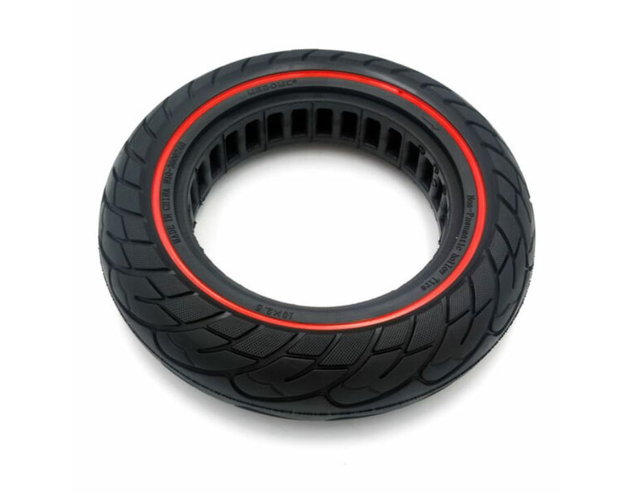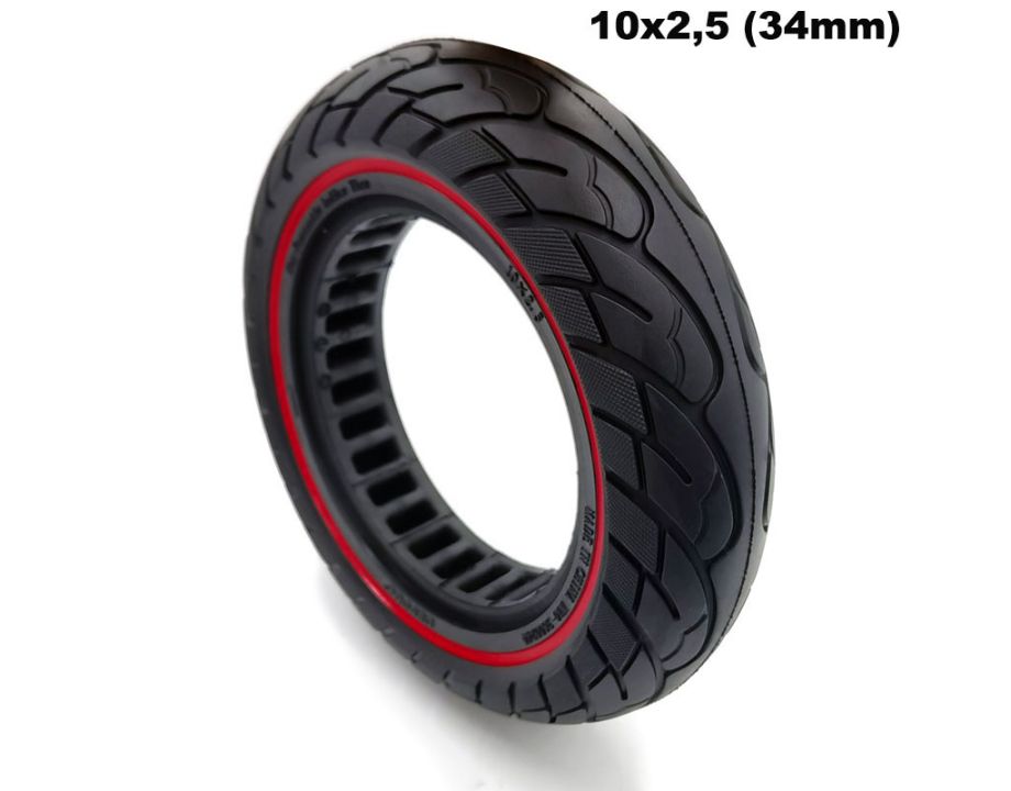 Rueda maciza ultraligera con dimensiones 10×2.5 y línea roja embellecedora.