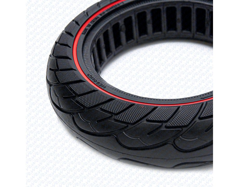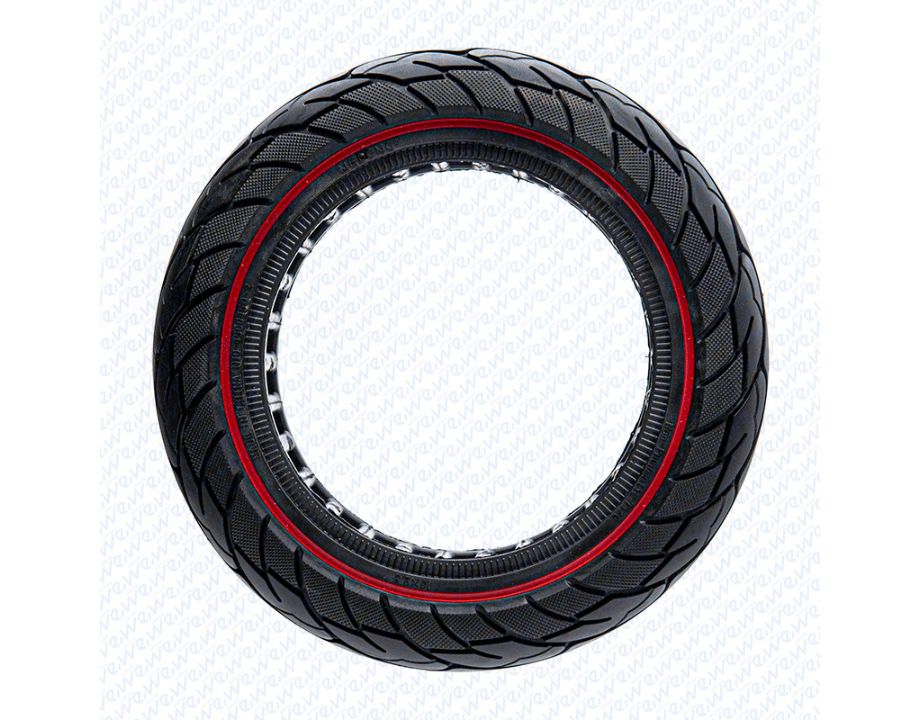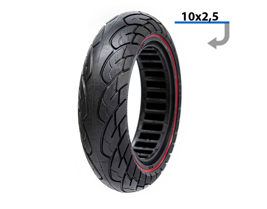 Rueda maciza ultraligera con dimensiones 10×2.5 y línea roja.