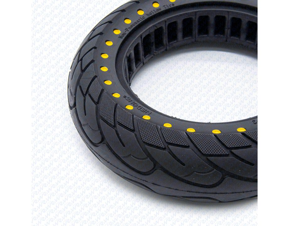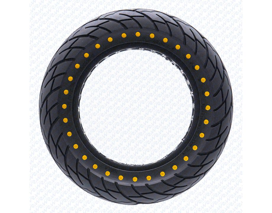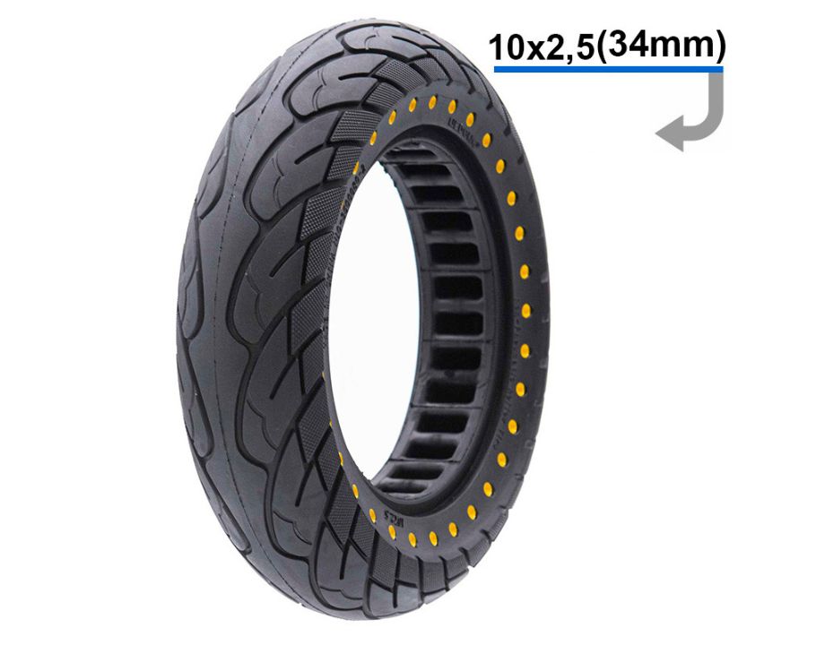 Rueda maciza ultraligera con dimensiones 10×2.5 y puntos amarillos.