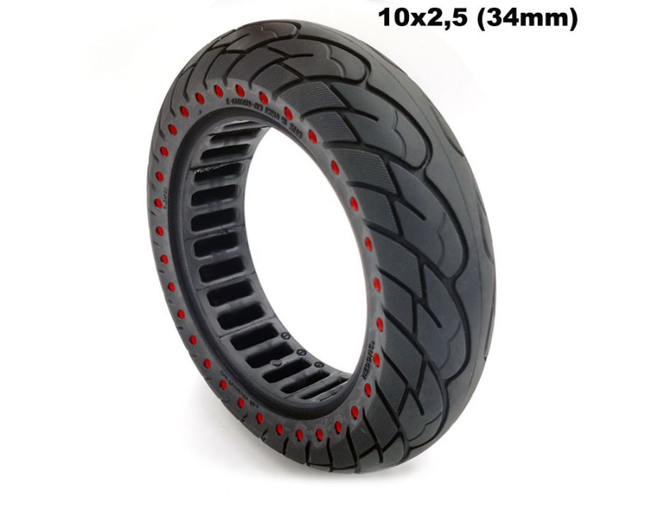Rueda maciza ultraligera con dimensiones 10×2.5 y puntos rojos embellecedores.
