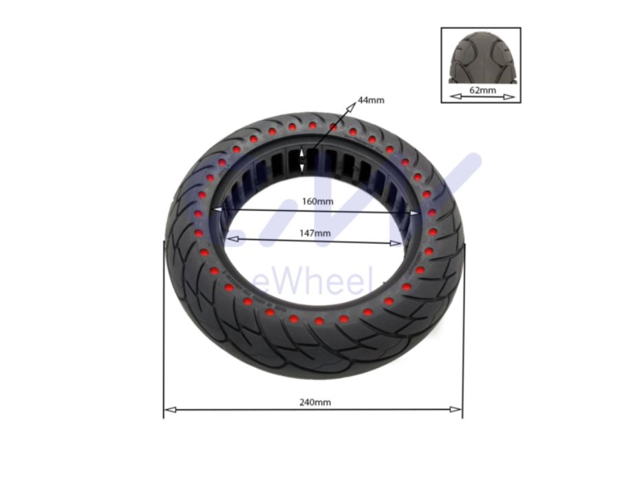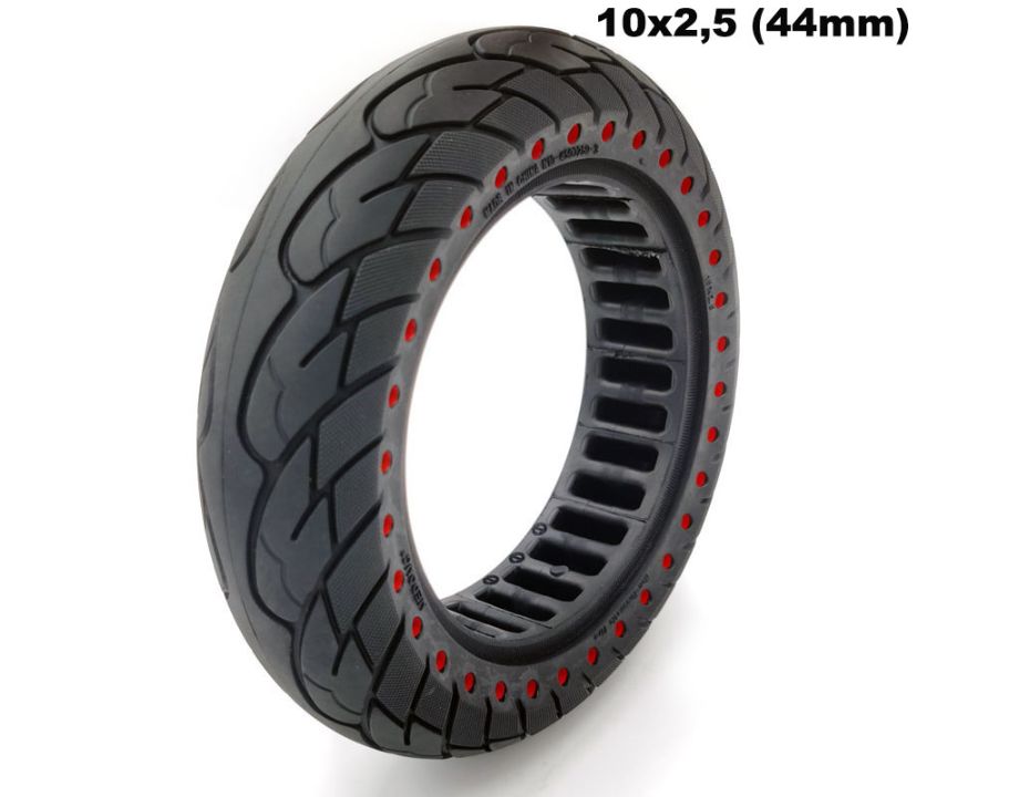 Rueda maciza ultraligera con dimensiones 10×2.5 y puntos rojos embellecedores.