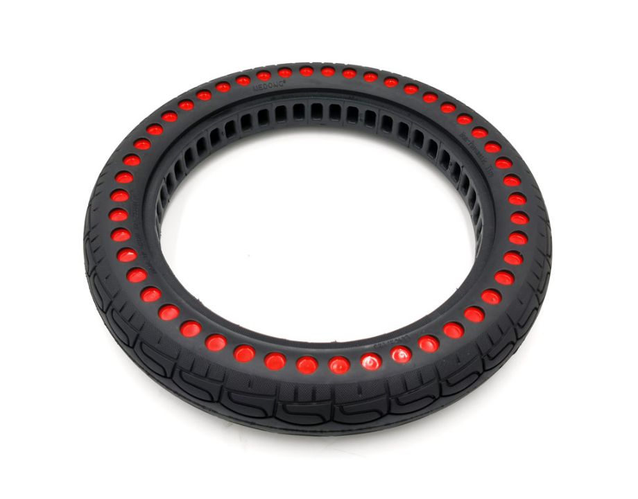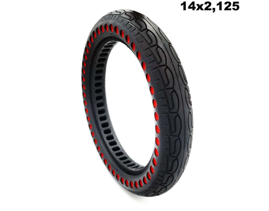 Rueda maciza ultraligera con dimensiones 14×2.125 y puntos rojos embellecedores.