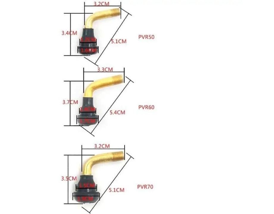 Válvula curva para neumáticos tubeless disponible en 4 medidas diferentes.