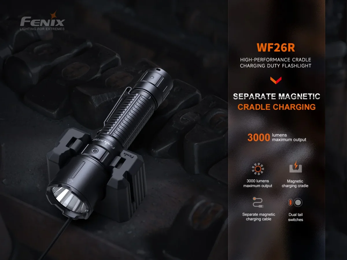 La linterna recargable Fenix WF26R con base de carga desmontable, permite mantener su linterna funcionando a plena capacidad. Cuando se almacena con la base de carga desmontable incluida, su linterna siempre estará lista cuando la necesite. Y con sus 3000 lúmenes y más de 450 metros de distancia de haz de luz, esta linterna superará cualquier desafío.